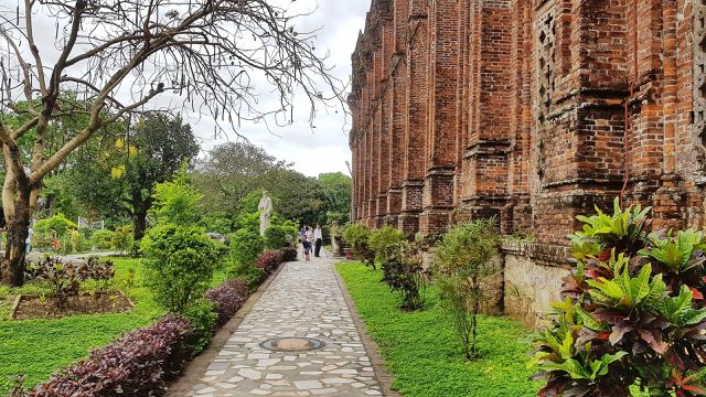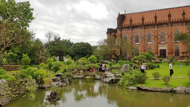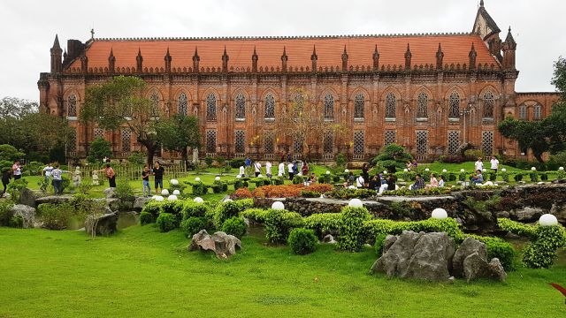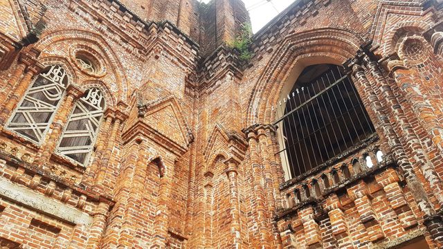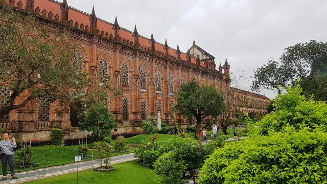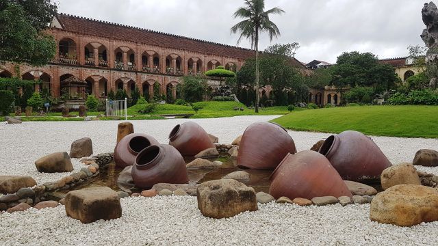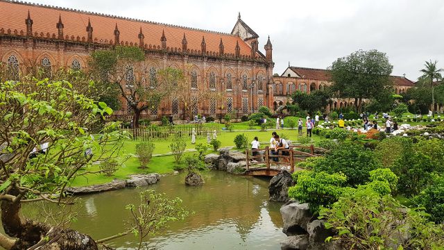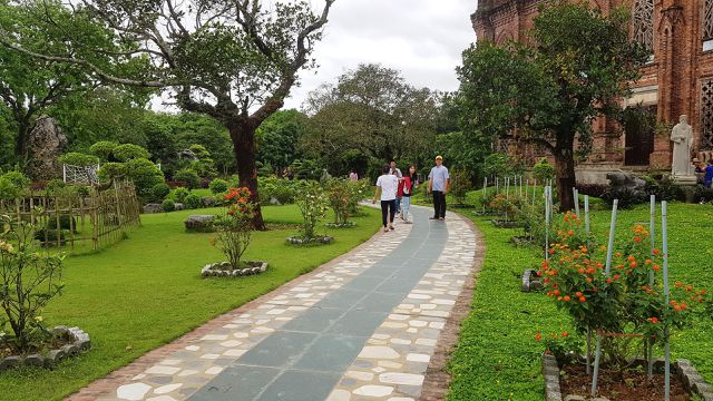 Với lối kiến trúc cổ Châu Âu, bên ngoài công trình được xây bằng gạch mộc, không tô vữa nên giữ nguyên màu gạch đỏ, càng khiến công trình nổi bật giữa nền thảm cỏ và cây cối xanh mát.