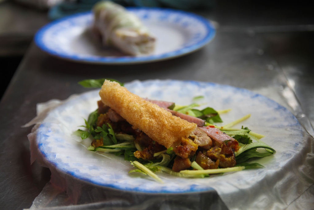 Món ăn với hương vị ngọt, thơm phức. Thưởng thức món cuộn gồm bánh tráng cuốn thịt nướng, nem chua, chả ram, rau sống gói lại, chấm ngập nước mắm đậu phộng chua chua ngọt ngọt ngon hết sẩy.