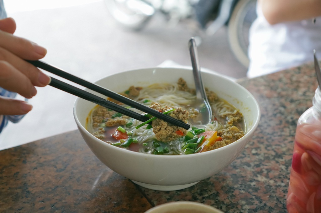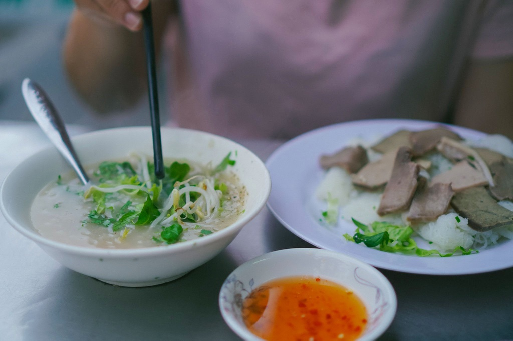 Món bánh thường có mặt trong bữa sáng của người dân địa phương. Bánh làm từ bột gạo, qua nhiều công đoạn khéo léo của người làm tạo nên món ăn tròn vị khi kết hợp với cháo và lòng heo.