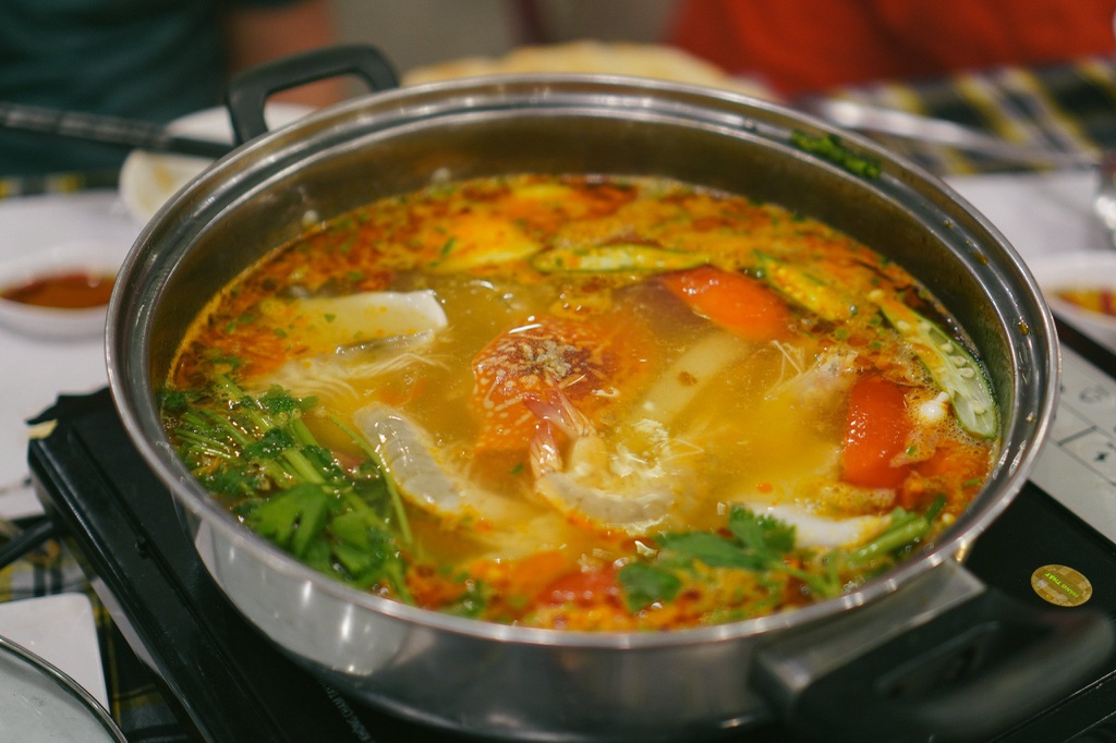 Bữa tối là lúc nhóm du khách cùng quây quần bên nồi lẩu nghi ngút khói. Trong nhiều loại lẩu thì nên thưởng thức lẩu hải sản với nguyên liệu tươi ngon như tôm, cua, sò, bạch tuộc…
