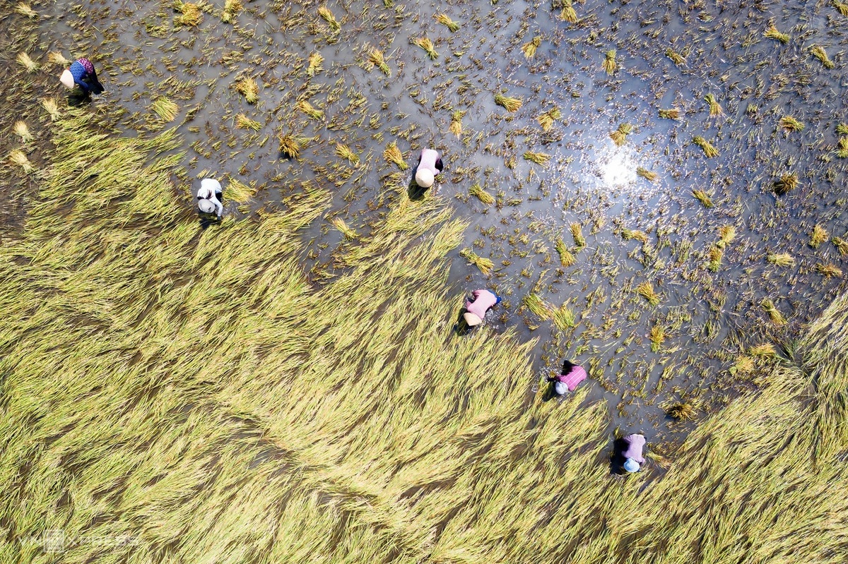 Người nông dân hối hả gặt lúa do gió lớn khiến lúa ngã rạp. Bức ảnh chụp tại huyện Cờ Đỏ, Cần Thơ.
