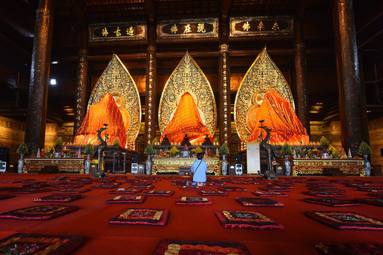 Trung tâm điện Tam Thế đặt 3 pho tượng Phật bằng đồng dát đồng đen, mỗi bức nặng 200 tấn.