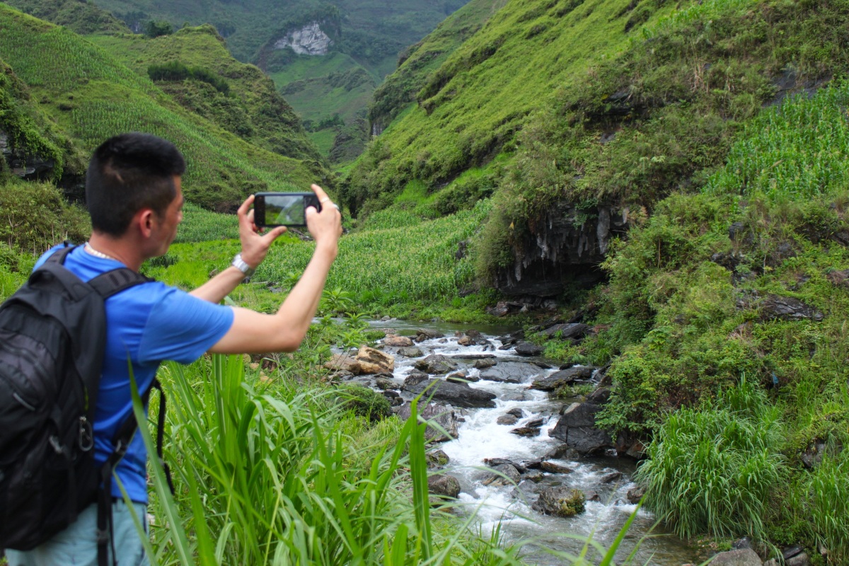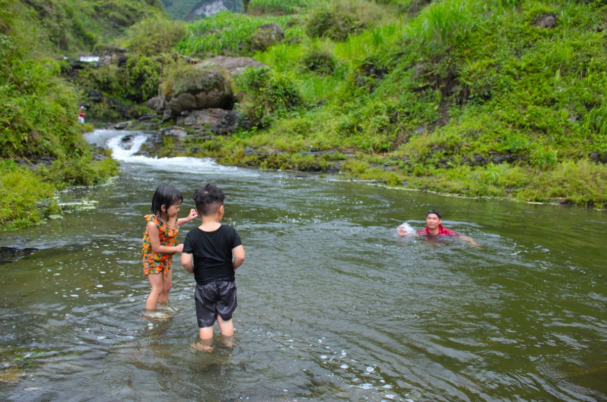 Sau khi lội suối, băng qua các vườn lanh, shop thời trang siêu cấp nương ngô hay những đoạn đường đất trơn trượt… tiếng suối đã gần bên tai hơn. Và rồi một dòng suối trắng xóa len lỏi hiện ra với phong cảnh đẹp như tranh vẽ.