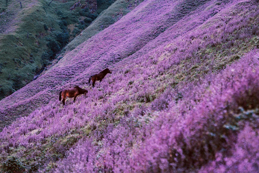 Trên cung đường chinh phục đỉnh Tà Chì Nhù, thi thoảng thấp thoáng bóng dáng của những đàn dê, đàn ngựa của người dân địa phương đang nhởn nhơ gặm cỏ bên đồi hoa như trong cổ tích.