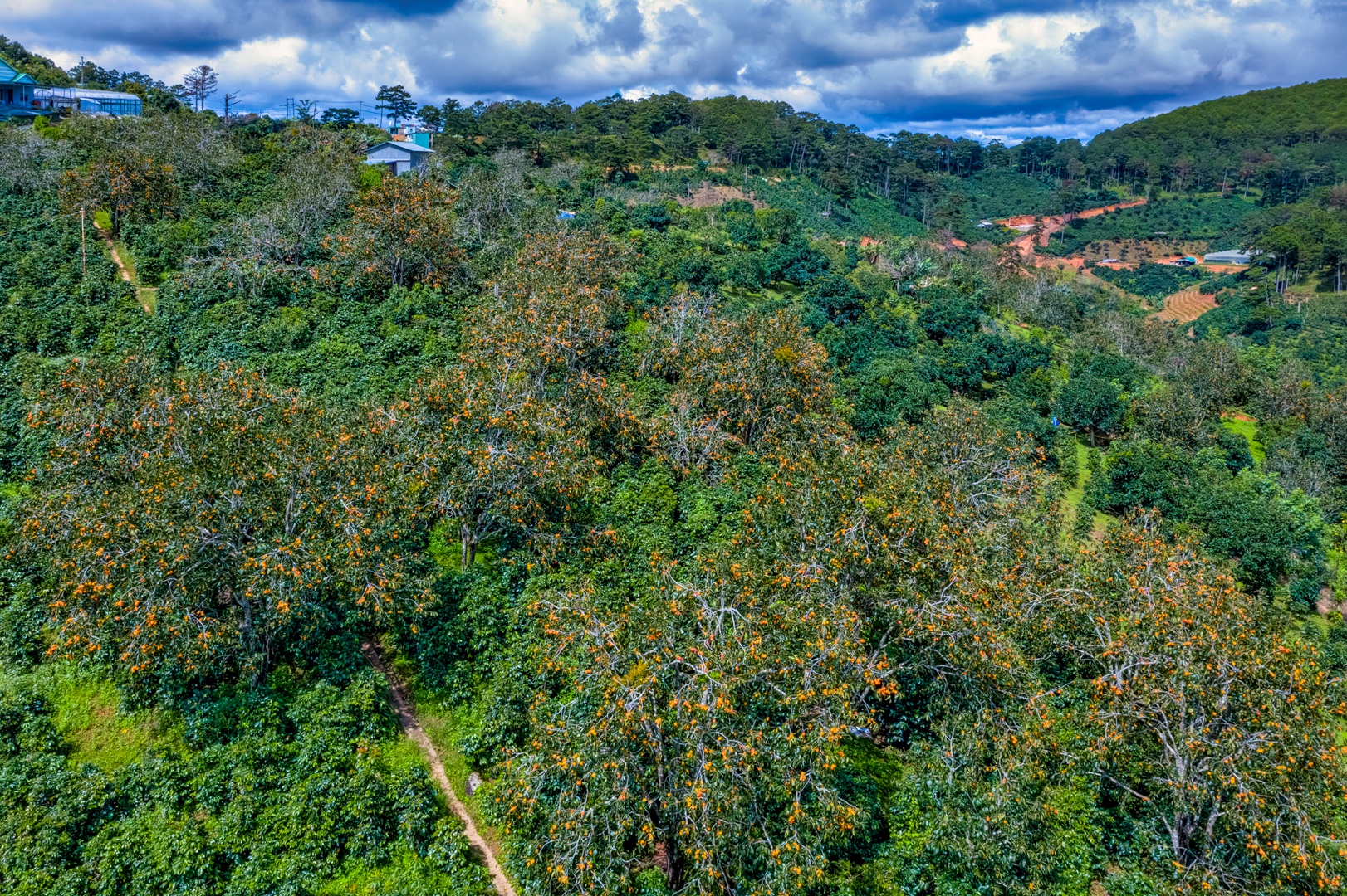Mùa hồng Đà Lạt bắt đầu từ cuối tháng 8 đến cuối tháng 12 hàng năm. Dọc các tuyến đường nơi vùng ngoại thành Đà Lạt trải dài sắc cam trên nền xanh.