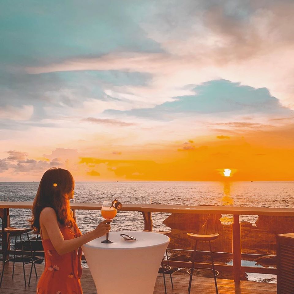 Với thiết kế quầy bar trên bãi đá nhô ra biển tạo không gian lãng mạn, nơi các cặp đôi hò hẹn chiêm ngưỡng hoàng hôn lý tưởng.