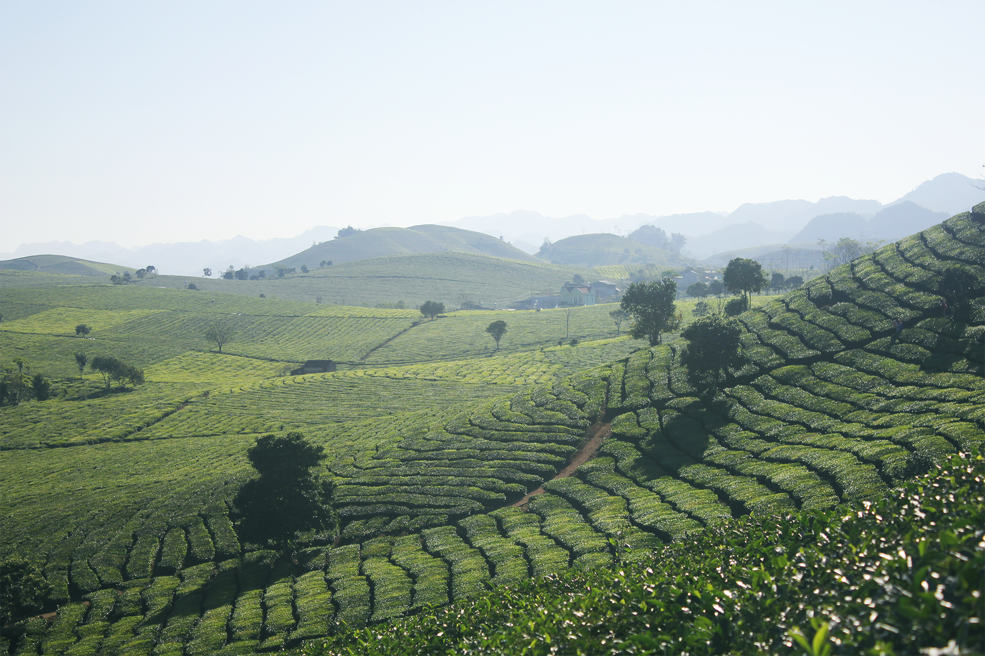 Buổi sáng du khách có thể di chuyển đến làng chè, nơi có bạt ngàn mênh mông đồi chè xanh mướt. Điểm đến này khá mới lạ vì du khách thường chỉ nhắc tới đồi chè Trái Tim. Làng chè cách trung tâm thị trấn Nông trường Mộc Châu khoảng 2km.