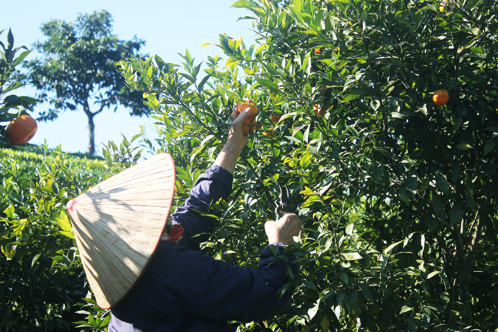 Cách thung lũng mận Nà Ka chừng 1km là vườn quýt rộng đang vàng rực, du khách có thể ghé chụp ảnh và mua về làm quà, giá vào vườn là 20.000đ.
