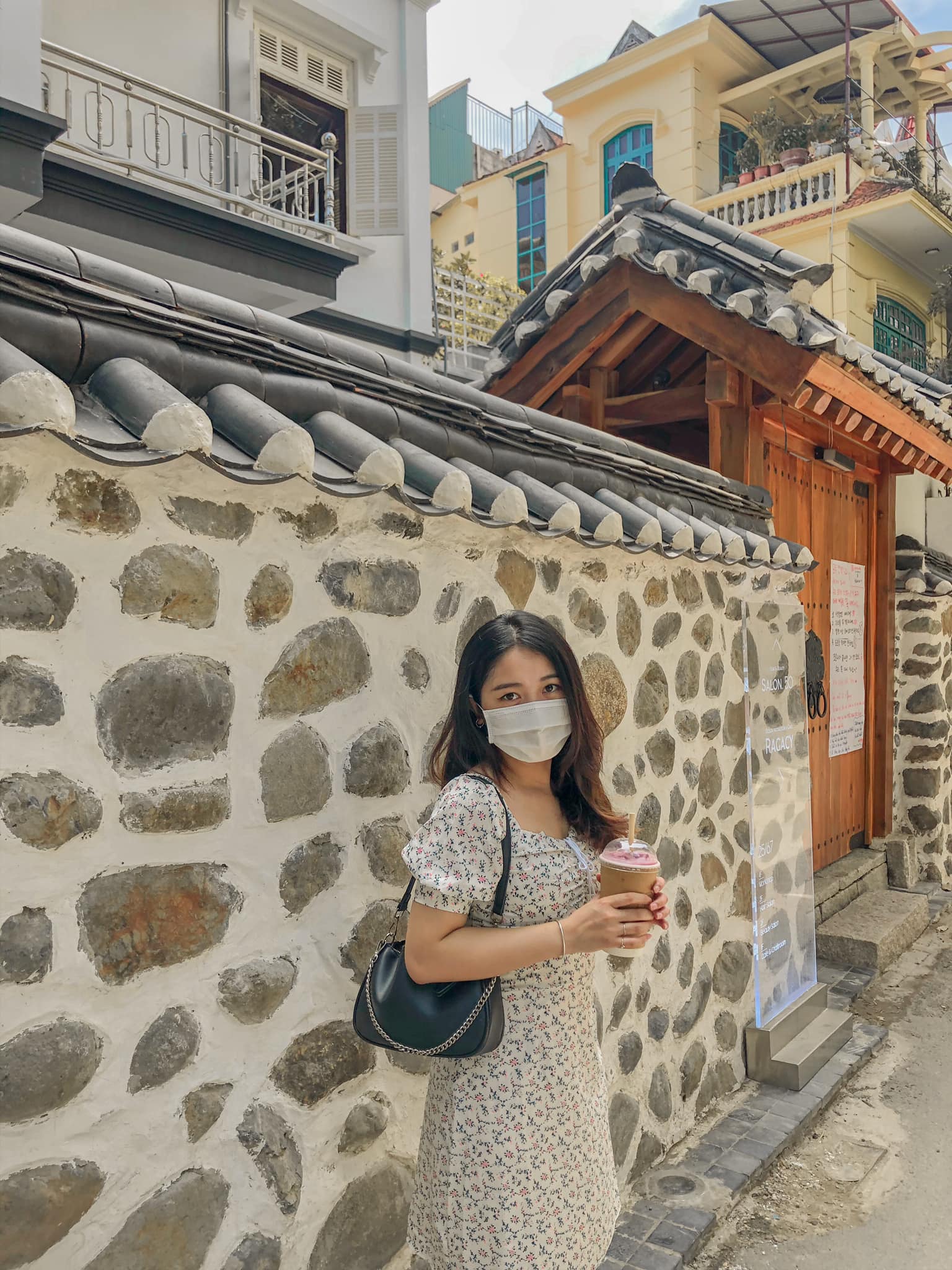 Bức tường bao và cửa vào quán cafe Ragace tại số 67 Tô Ngọc Vân, Tây Hồ. Bức tường đá với mái ngói âm dương và cửa gỗ giống như một góc ở xứ sở Kim chi.