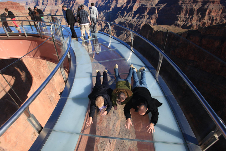 Cầu kính Grand Canyon (Mỹ): Cầu kính đại vực này có thiết kế hình móng ngựa với độ cao 1.220m. Để hoàn thiện cây cầu này mất thời gian 4 năm với nguyên liệu khoảng 500 tấn thép, 28 tấn kính. Đứng trên cầu kính, phóng tầm mắt sẽ thỏa sức ngắm đại vực Grand Canyon.