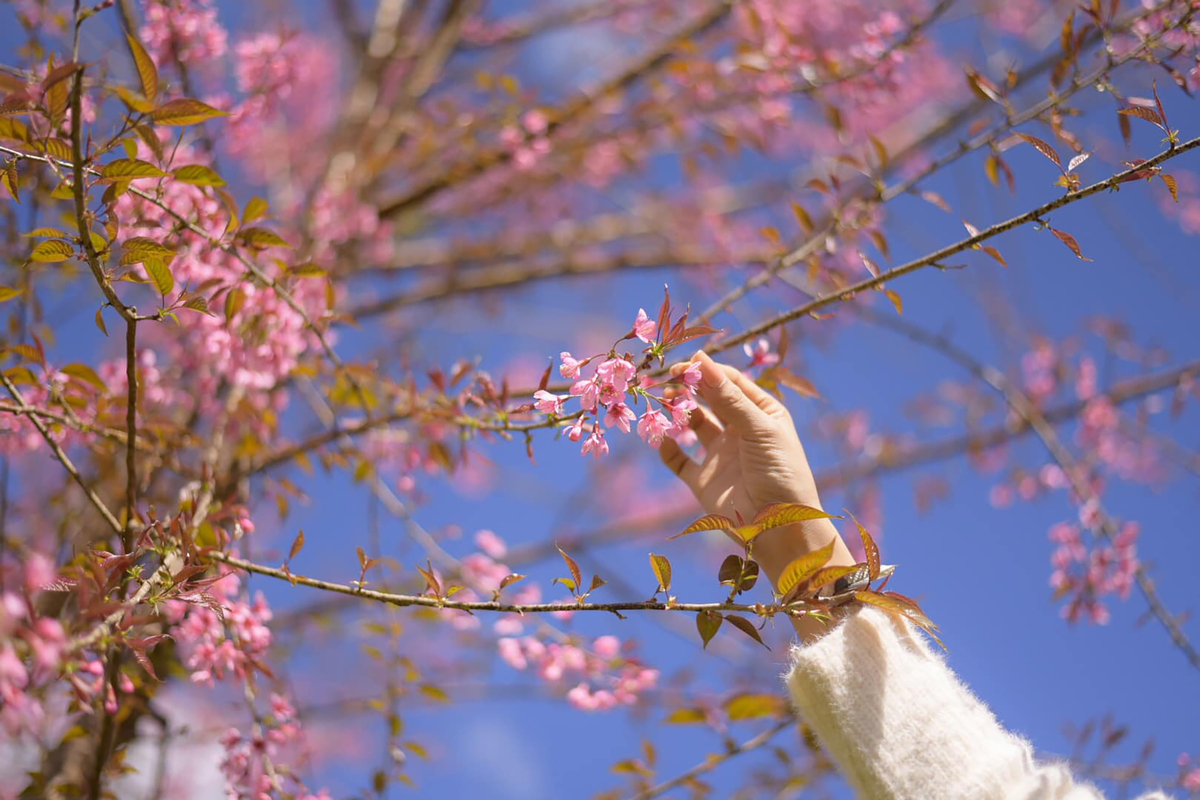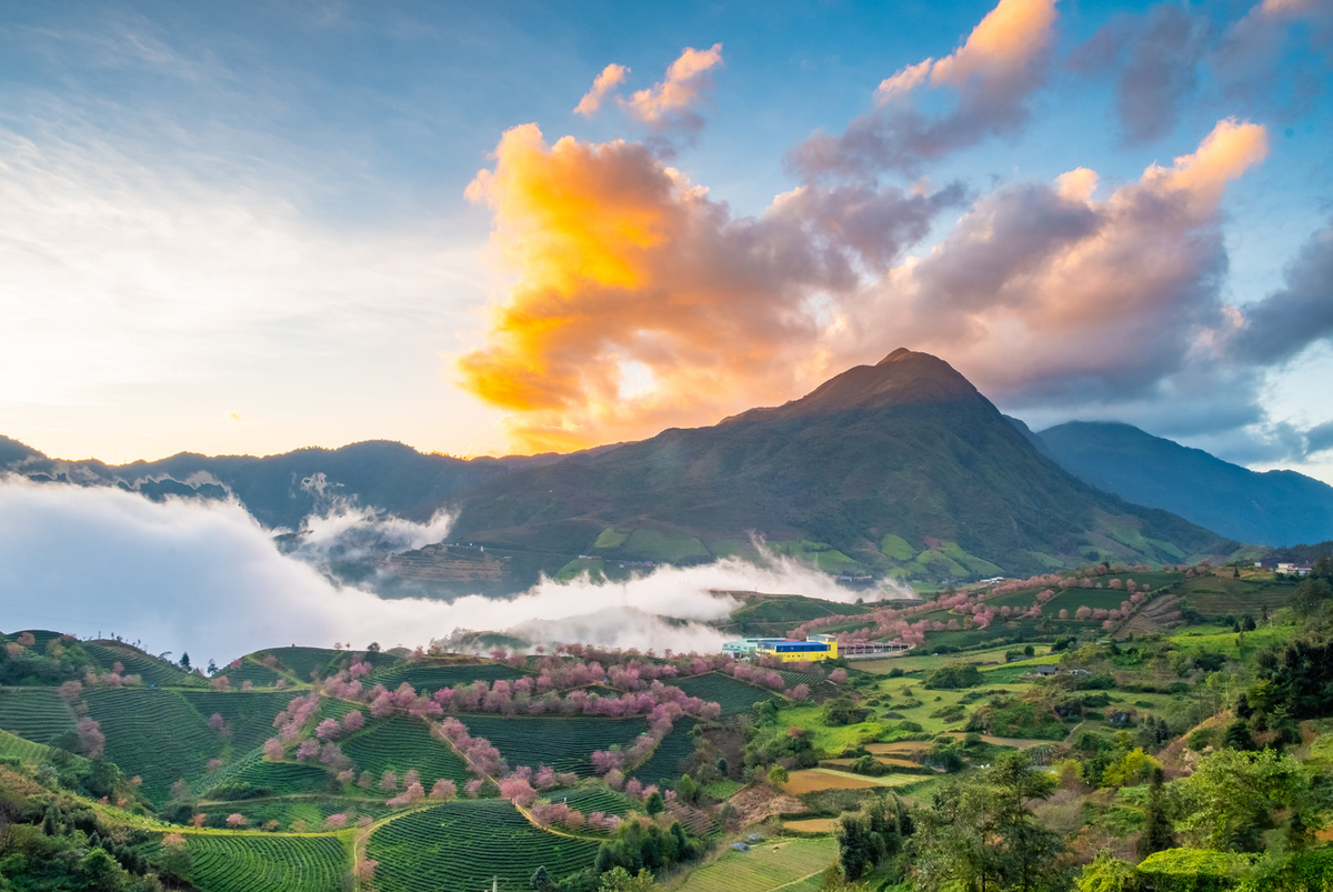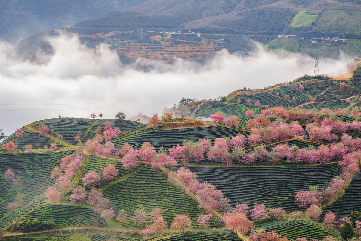 Dọc cung đường Tây Bắc, du khách chẳng thể bỏ lỡ trải nghiệm ngắm mai anh đào ở xứ sở mù suong Sa Pa. Từ trên cao, đồi chè xanh ngát làm nền điểm xuyết cho sắc hồng rực của những rặng mai anh đào nối nhau giữa bầu trời với những đám mây lững lờ trôi.