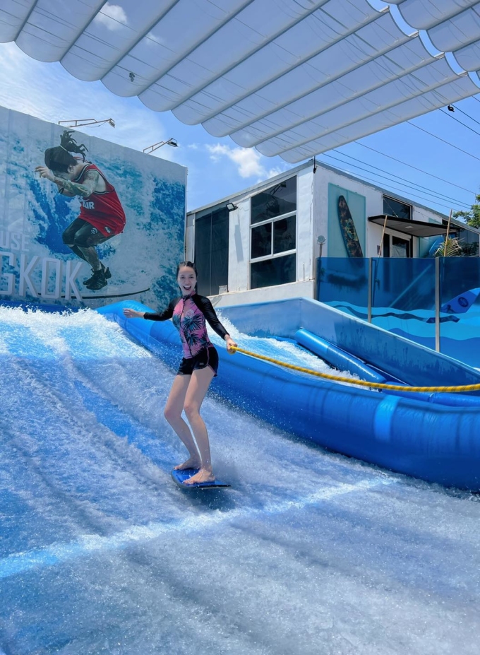 Diệu Nhi trong chuyến du lịch Bangkok đã không bỏ lỡ trải nghiệm thú vị là lướt ván tại trung tâm huấn luyện ở trung tâm thành phố.