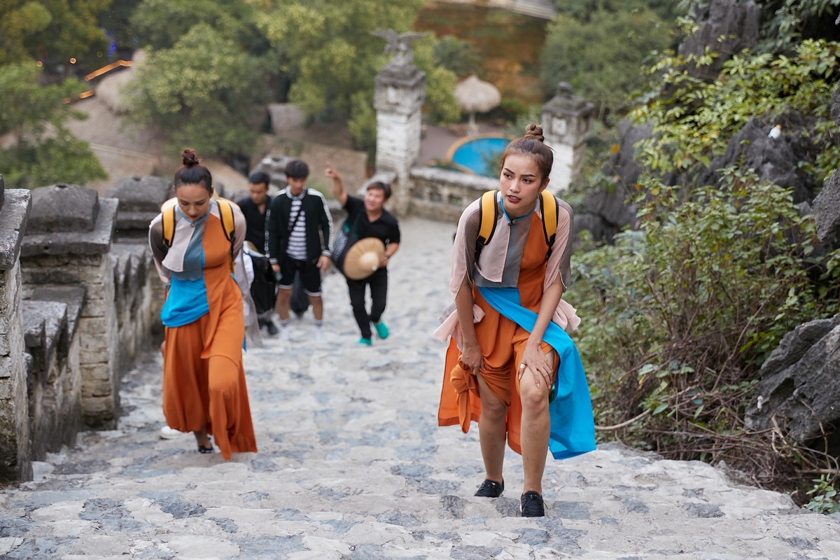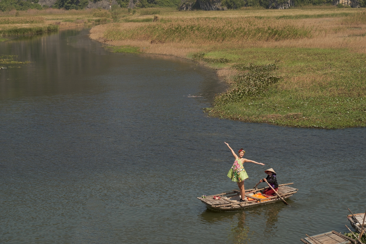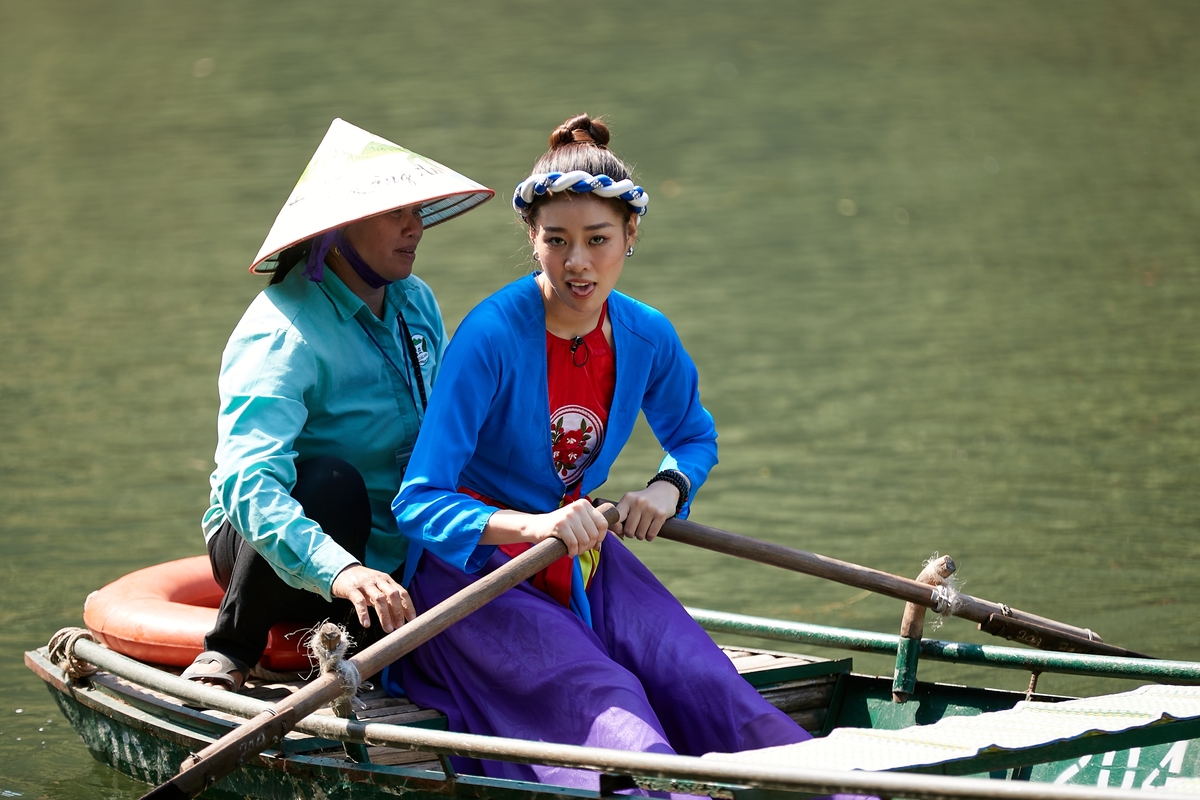 Khánh Vân vật vã điều khiển mái chèo, Quỳnh Châu nhảy xuống bến thuyền Tràng An chụp hình còn Ngọc Diễm có điệu múa trên thuyền.