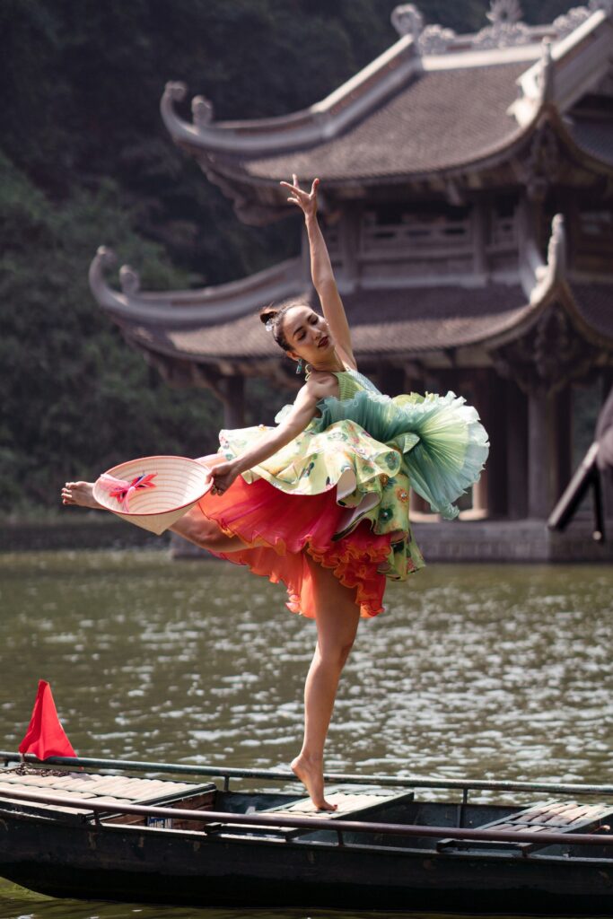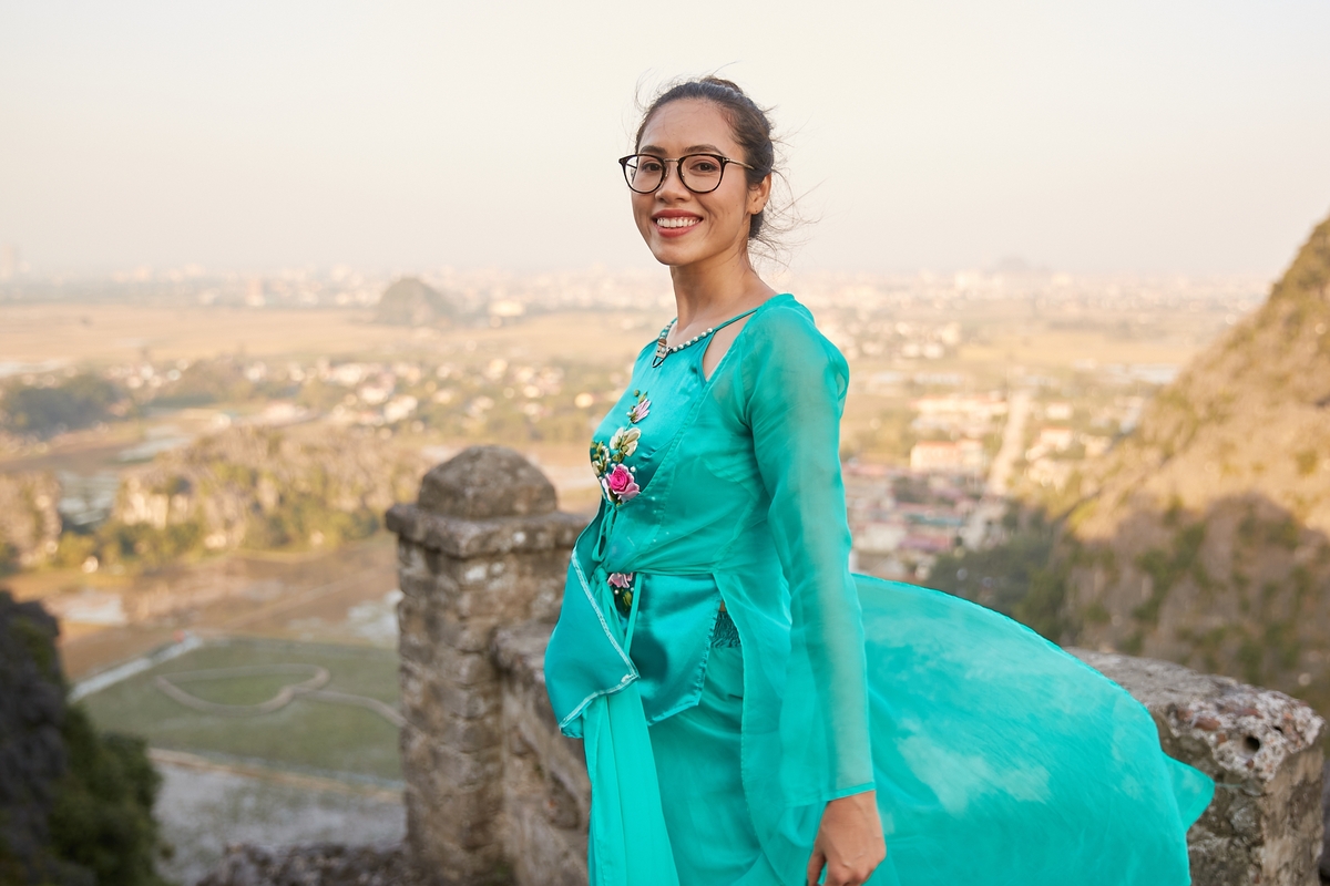 Ngọc diễm biểu diễn tài năng múa khi đứng một chân trên thuyền với mong muốn truyền tải nét đẹp của phụ nữ Việt dịu dàng mà cá tính. Hình ảnh cô nàng với chiếc váy xòe nổi bật trước background là Thủy Đình ở Tràng An.