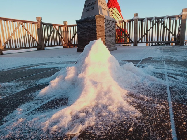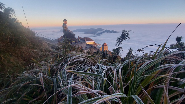 Đêm 20.12 nền nhiệt trên đỉnh Fansipang xuống thấp, chỉ còn -3 độ C. Sáng ngày 21.12, sương muối và băng tuyết phủ trắng đỉnh Fan.